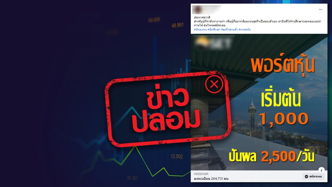 ตามที่มีการโฆษณาเชิญชวนเกี่ยวกับประเด็นเรื่องตลาดหลักทรัพย์แห่งประเทศไทยเปิดพอร์ตหุ้น เริ่มต้น 1,000 บาท รับปันผล 2,500 บาท/วัน ทางศูนย์ต่อต้านข่าวปลอมได้ดำเนินการตรวจสอบข้อเท็จจริงโดยตลาดหลักทรัพย์แห่งประเทศไทย พบว่าประเด็นดังกล่าวนั้น เป็นข้อมูลเท็จ