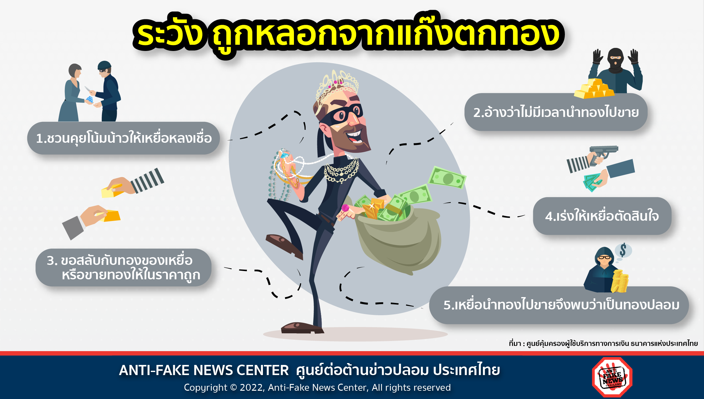 เมื่อราคาทองขึ้น ๆ ลง ๆ ใครหลายคนก็มักจะลงทุนด้วยการซื้อทองมาไว้ขาย หรือใช้หมุนเวียนในยามที่ทองมีราคาดี และอาจเป็นเส้นทางที่นำพาให้ต้องไปเจอกับแก๊งตกทองที่หลอกล่อเหยื่อให้หลงเชื่อด้วย 5 วิธีการ เพื่อฉ้อโกงดังนี้